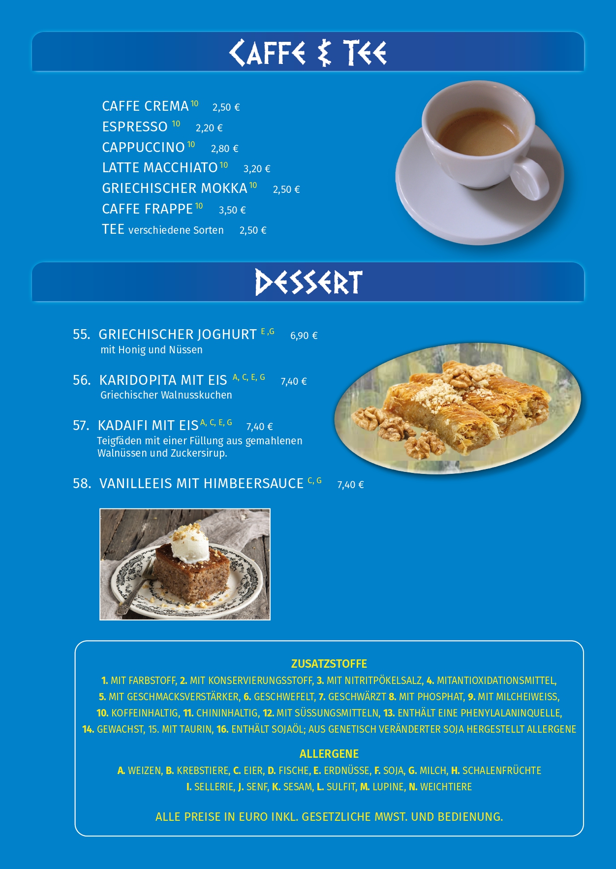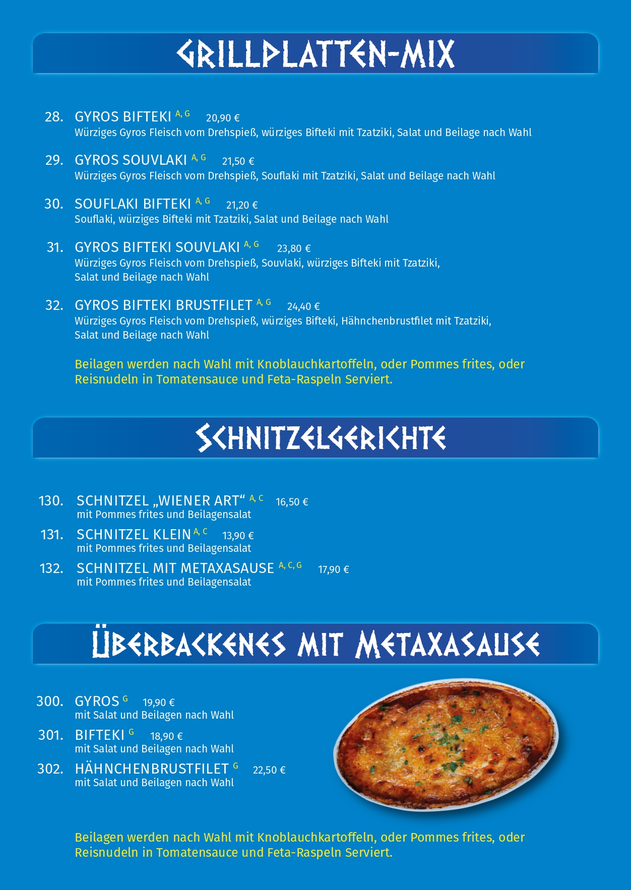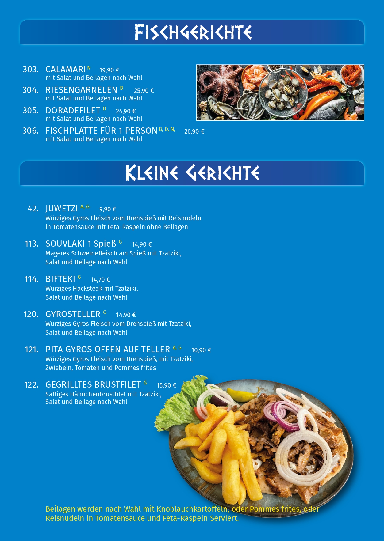 Entdecken Sie unsere vielfältige Taverna-Speisekarte und reservieren Sie gerne Ihren Tisch. Zusätzlich verwöhnen wir Sie auch mit unserem Lieferservice – Ihre Bestellung können Sie bequem online aufgeben. Bitte beachten Sie: Die Speisekarte im Restaurant unterscheidet sich von der unseres Lieferservices.